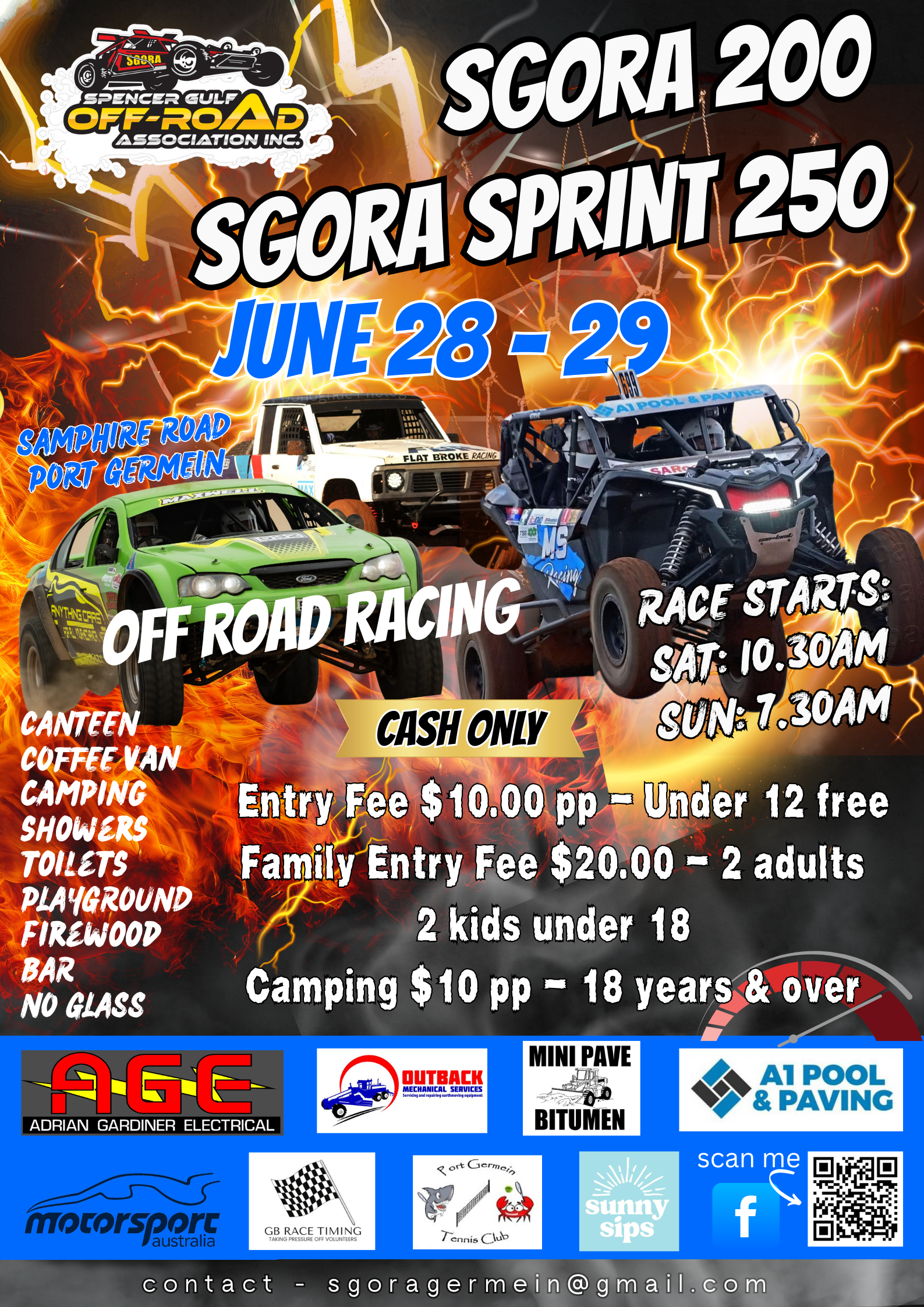 SPENCER GULF OFF-ROAD RACING ASSOCIATION Saturday 28th - Sunday 29th June 2025 Location: Samphire Road PORT GERMEIN - 60Km south of Port Augusta SEE GOGGLE MAP Supp Reggs 2025 SGORA_525.2906.01_Supp Regs_Approved (1) 2 Days of Action-Packed Racing Food and Drinks available all weekend ...